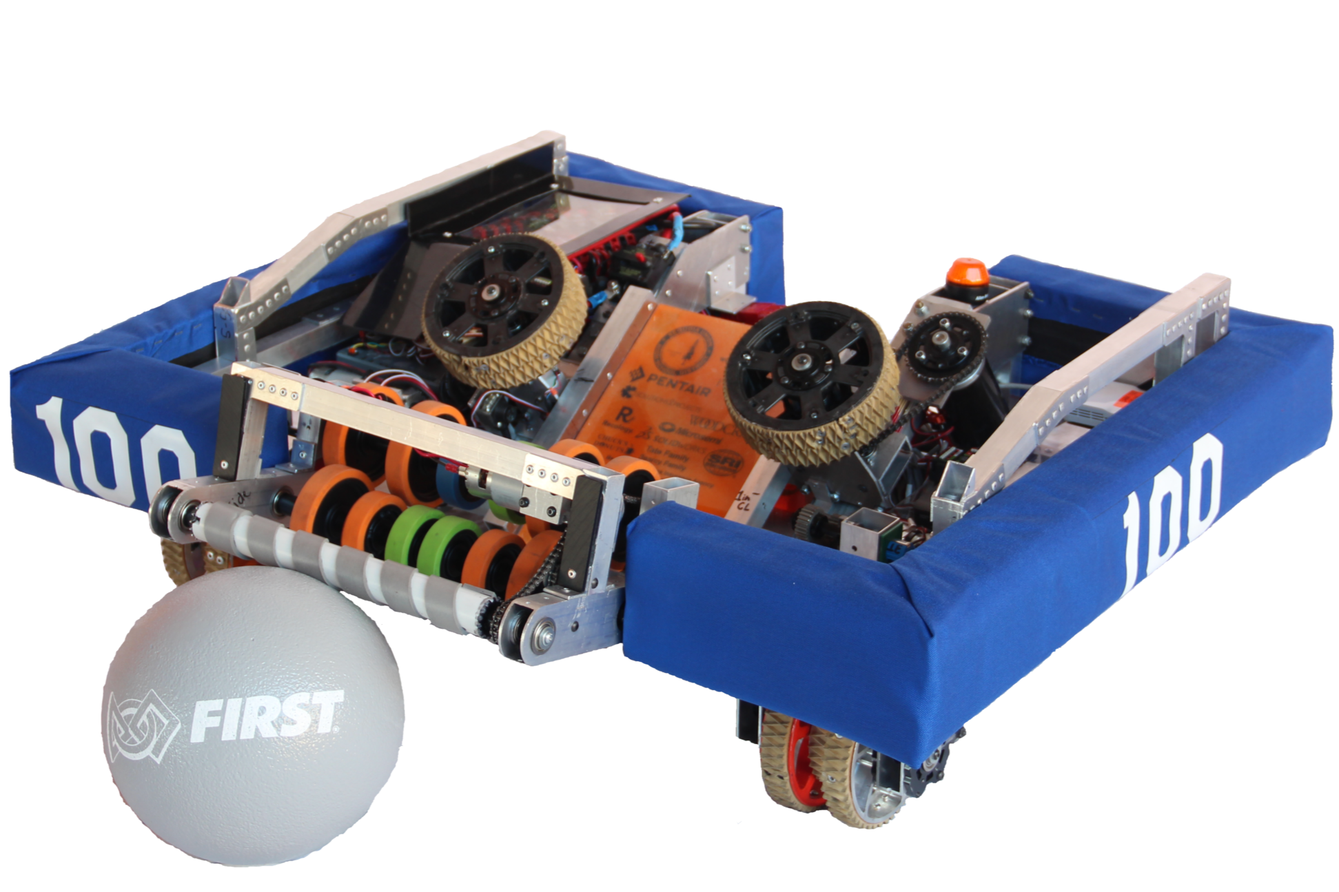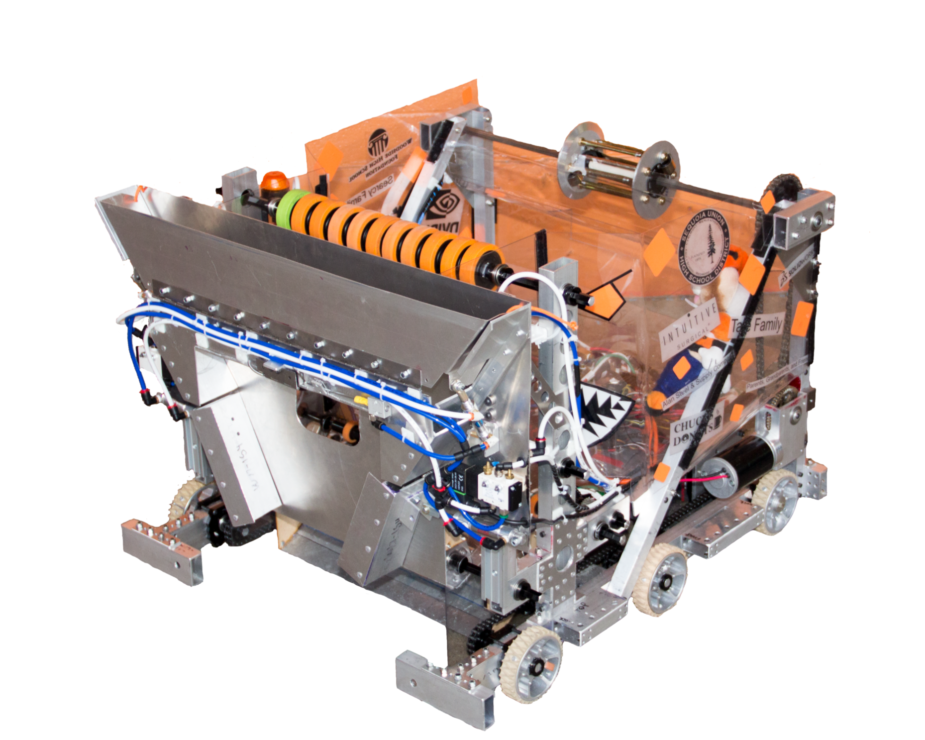 Inspiration: The intersection of the ball intakes with the transport belt is called the Bermuda Triangle, and all the belts resemble tentacles. Catchphrase: Release the Kraken! 119 pounds with ball-intakes on both sides and a 360-degree turret-shooter at the top. The turret received balls that were lifted up a conveyor from their storage bin within the frame. This robot contained a bridge-pusher to lower the bridge. Programmed in C++. 6-wheel tank drive with the middle wheels lower, to lower the turning friction.