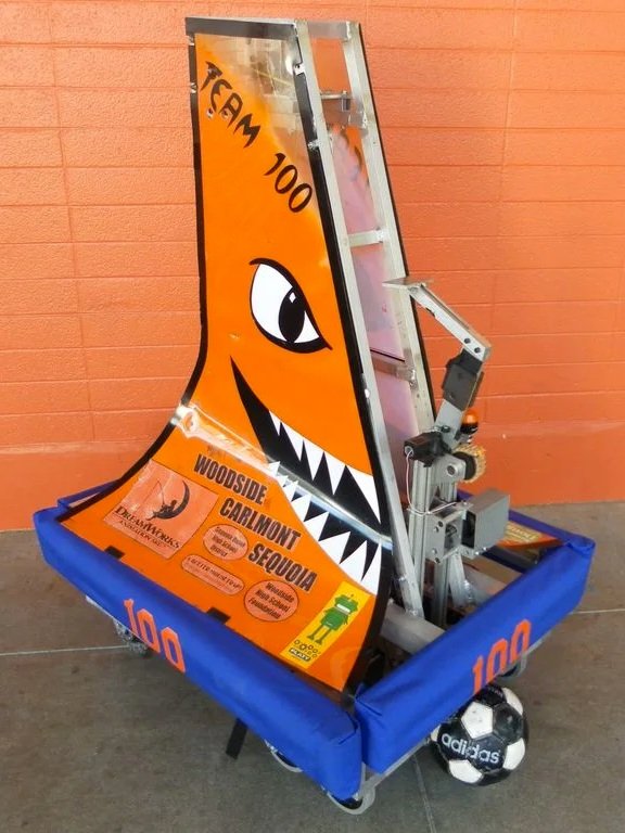 Inspiration: The robot is shaped like the dorsal fin of a shark, and it has a hammer-like kicker on the front. 4 motor tank drive with omni wheels in the back. The hanging mechanism was a hook velcroed to the end of the deployment pole. The pole would come up, grab onto the rung, and retract. While the pole retracted, the Velcro came off, and we would winch ourselves up to the top. The winch used a ratchet that allowed movement in one direction but prohibited movement in another. Able to hold on to the ball while swiveling, creating a dribble. Used vision to detect the ellipses of the targets over the goals (We used the size of the largest circle (in pixels) and estimated the distance to the goal to give us the desired kicker power. The formula seems to be 0.05/(# pixels of the radius of the largest circle) the result limited to lie between 0 and 1, formed the demand for the kicker motor.) The kicker's arm rest position was at about 10 o’clock, swung clockwise, and hit the ball at about 7 o’clock.