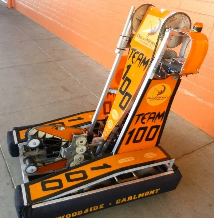 Inspiration: The name was a play on words of the Bullfrog, because it held a ball in its mouth, making it look like the large, inflated neck of a Bullfrog. The manipulator was able to hurdle the large trackballs and place them on the rack. Autonomous was programmed to make it around the track, crossing up to four lines. This robot had the ability to acquire balls off of the overpass and had an elevator to lift and lower game pieces.