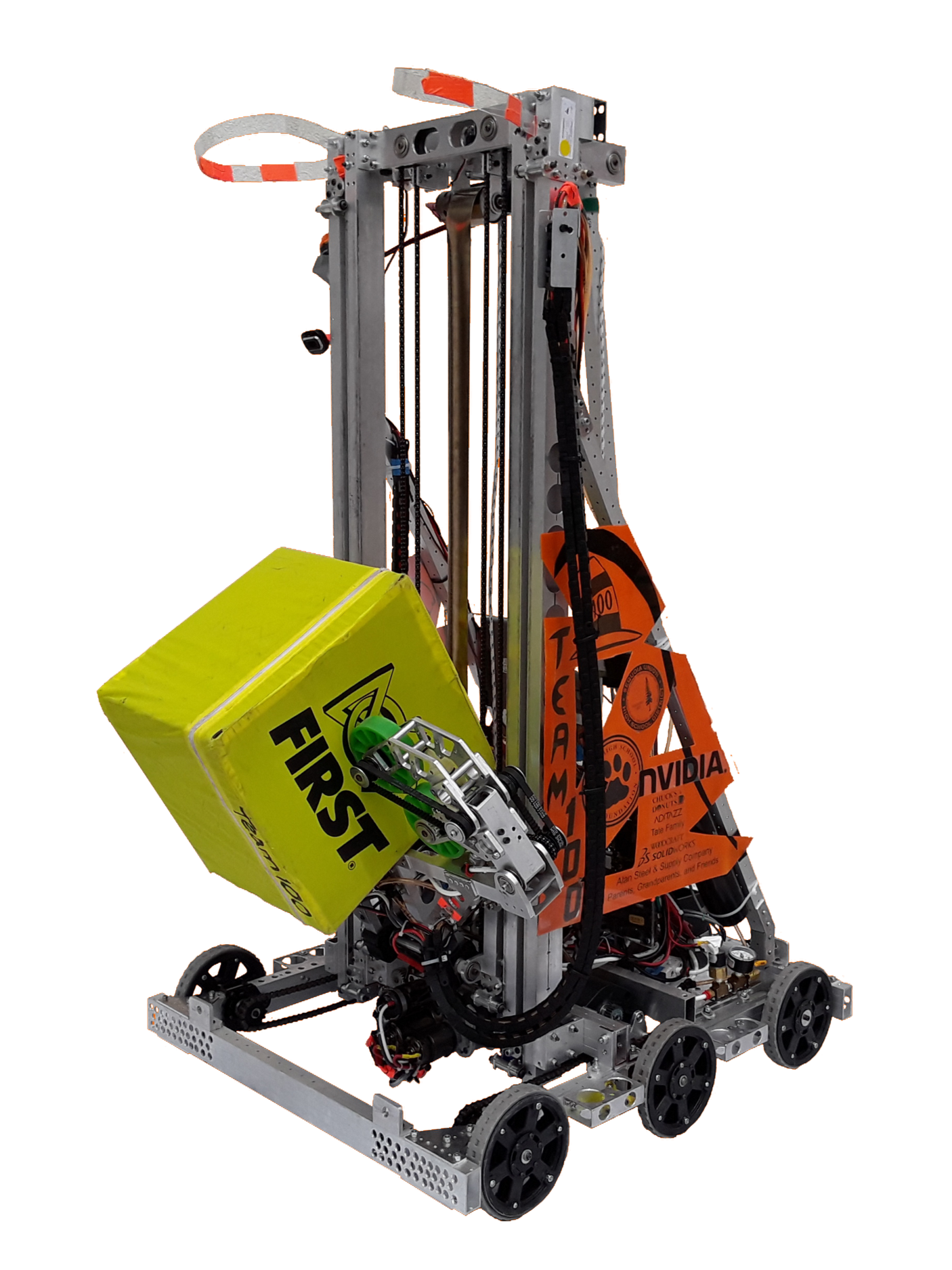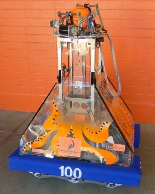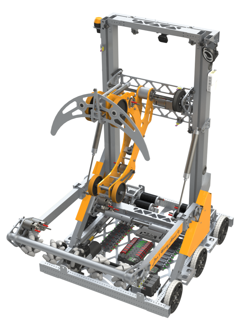 Inspiration: The long arm/neck makes it look like a giraffe. It was similar to Tube-A-Saurus-Rex. 115 pounds, 4 motor drive with gear shifting (one solenoid valve and piston for each side of the drive train), a 6 wheel drop center for lower friction turns, pneumatics, and LED rings on the camera for retroreflective tape detection. The arm was designed to lower in both the front and back of the robot with a shoulder motor and worm gear assembly that rotated around a fixed gear on the frame. The head allowed for manipulation using 2 independently controlled rollers. One on the top “jaw” and one on the bottom “jaw”. It could suck in a tube by driving the rollers forward and spit it out by driving the rollers backward. It could also rotate the tubes up and down by driving the rollers opposite each other. Gas shocks and springs counterbalanced the weight of the arm, and a pneumatic wrist kept the head stored within the frame (two possible positions of wrist deployment: stowed and tube hanging). This robot also had the ability to deploy a Minibot(move in, move out).