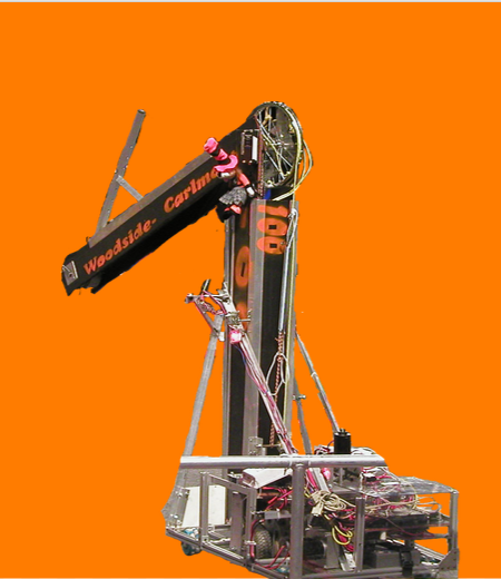 Inspiration: Looks like a Medieval Ballista and launches "boulders "(Foam Balls). 4 wheel drive, supplementary tank treads for traction, 91 lbs, 12 treaded wheels, lifts portcullis, moves Cheval de frise, shoots ball into high and low goal.
